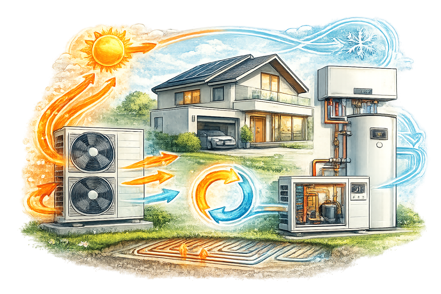 Eine Wärmepumpe nutzt Umweltenergie aus Luft, Erde oder Wasser, um Gebäude zu heizen und Warmwasser bereitzustellen. Sie arbeitet besonders effizient und kommt ohne fossile Brennstoffe aus. In Kombination mit Photovoltaik ist sie eine besonders nachhaltige Heizlösung.