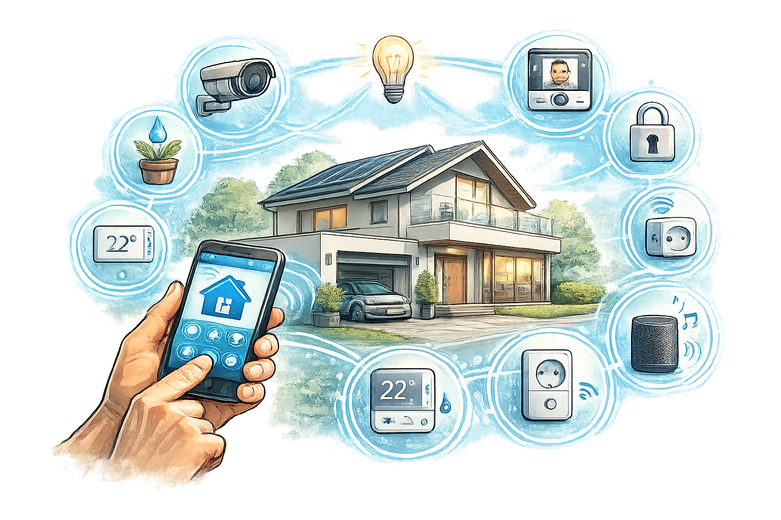 Ein Smart Home vernetzt verschiedene Geräte wie Beleuchtung, Heizung, Rollläden oder Sicherheitssysteme intelligent miteinander. Die Steuerung erfolgt automatisch, per App oder Sprachbefehl. Das sorgt für mehr Komfort, höhere Sicherheit und eine effizientere Energienutzung.